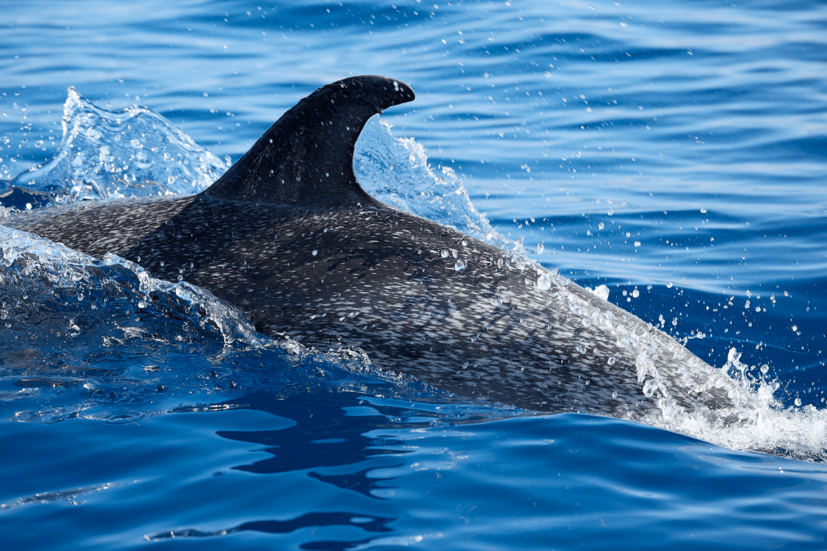 Cloaked in starlight speckles, the voyager breaches the surface. Each splash is a step into the unknown. Moving with quiet bravery, she charts a course through the endless, sapphire wild.