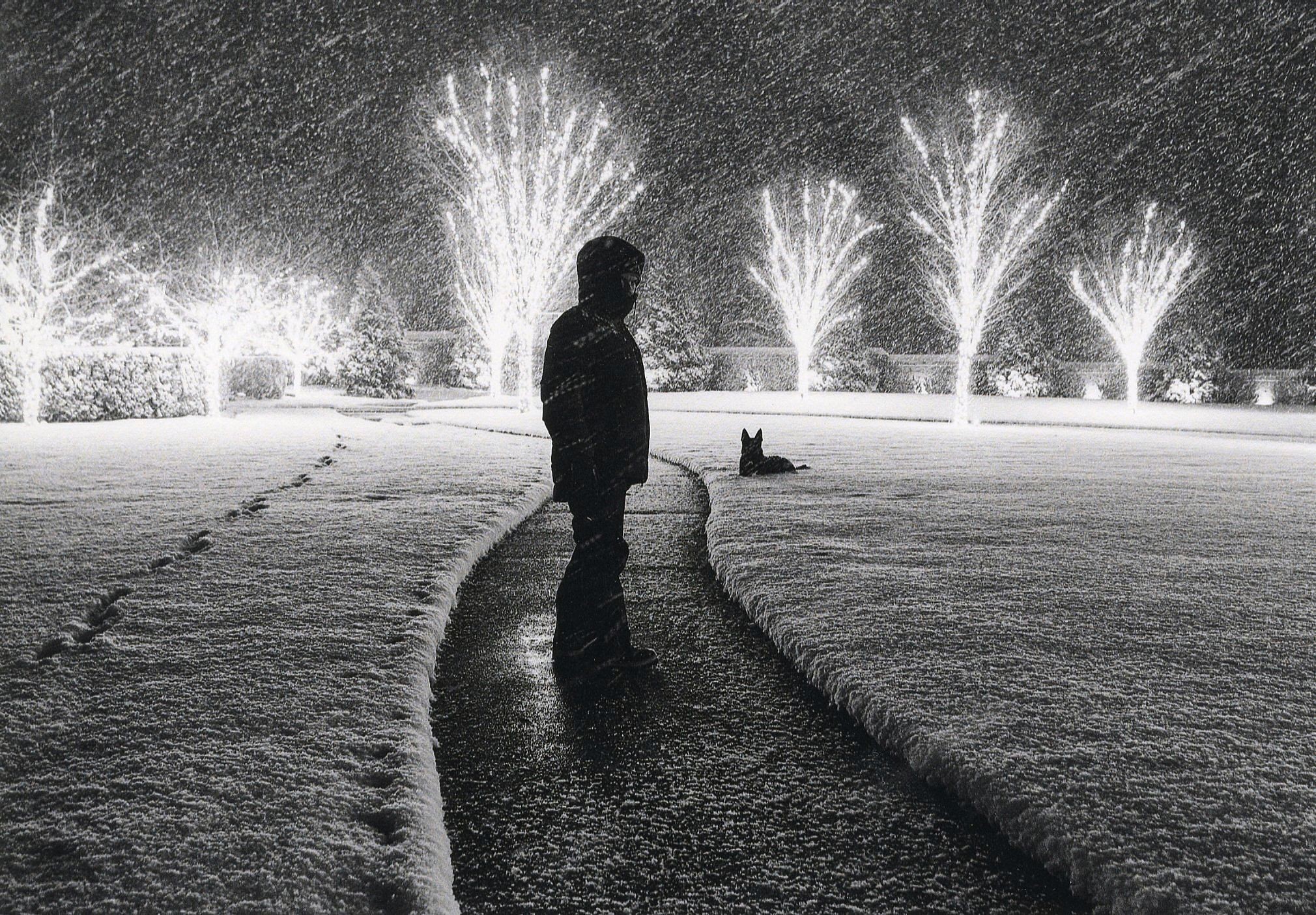 Exiled from the warmth, a lone silhouette holds the line against the blizzard's fury. Beside their silent companion, they find a savage peace on the edge of the illuminated world.